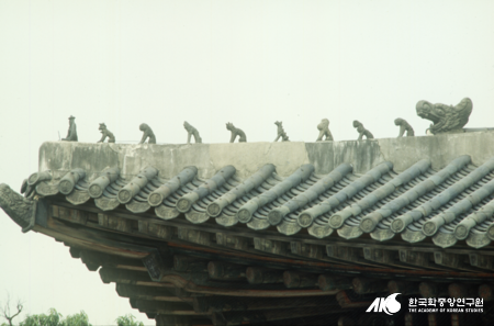 서울 창덕궁 인정전의 잡상들. 기와지붕의 추녀마루 위에 놓이는 와제 토우들인 장식기와의 하나.(한국민족문화대백과사전의 사진과 설명)